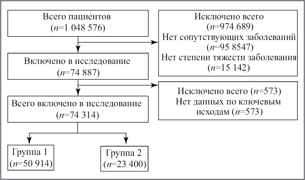 Критериями включения явились наличие у больного указаний на пол, возраст, социальный статус/род занятий, сопутствующие заболевания сердечно-сосудистой системы (ЗССС), бронхолегочной системы (ЗБЛС), онкологические заболевания (ОЗ), эндокринные заболевания (ЭЗ) и заболевания, не относящихся к выше перечисленным, – другие заболевания (ДЗ), наличие госпитализации, повышение температуры тела, ринит, кашель, одышка, усталость, потеря обоняния, потеря вкуса, диарея, боль в горле, контакт с больными COVID-19, место установления диагноза, степень тяжести заболевания. Критериями исключения явилось отсутствие сведений о сопутствующих заболеваниях, степени тяжести заболевания и наличии или отсутствии госпитализации. Краткая схема дизайна исследования приведена на рис. 1. Всего 74 314 пациентов были разделены на 2 группы: госпитализированные – группа 1 (n=50 914, 68,5%) и негоспитализированные – группа 2 (n=23 400, 31,5%).