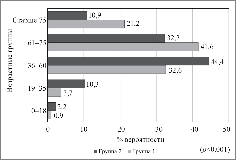 Анализ социально-демографических характеристик больных показал, что среди госпитализированных (группа 1) преобладал возраст 61–75 лет – 41,6%, среди амбулаторных пациентов (группа 2) эта возрастная группа встречалась реже – 33,2% (p<0,001). Возраст 36–60 лет доминировал среди пациентов группы 2 – 44,4%, в группе 1 пациенты этой возрастной группы встречались в 32,6% случаев (p<0,001; рис. 2). Женский пол чаще регистрировался среди амбулаторных больных – 67,1% против 59,4% в группе 2 (p<0,001).