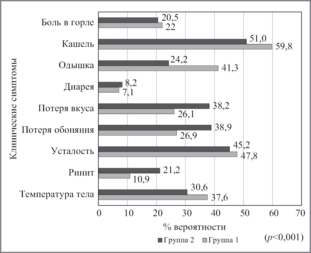 Оценка клинических данных, доступных при мониторинге, показала, что наиболее значимыми для госпитализации являлись такие симптомы, как одышка, потеря вкуса, потеря обоняния и ринит (рис. 3).