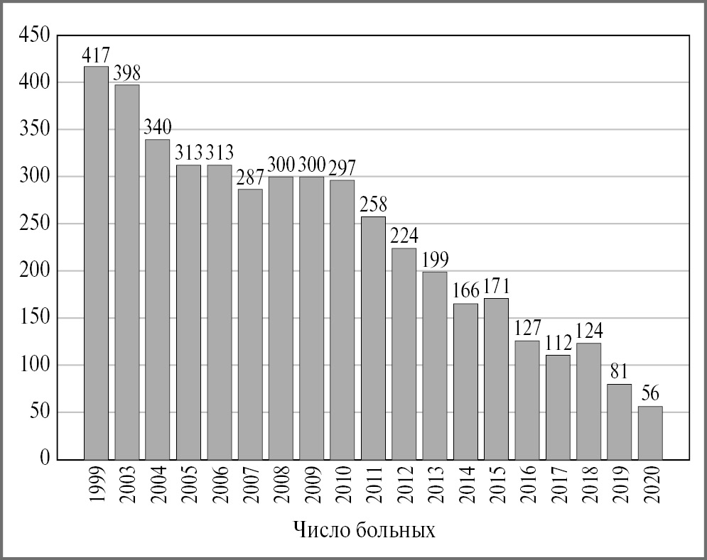 За 20 лет анализируемого периода число больных изолированным УГТ неуклонно сокращалось. Хотим подчеркнуть – речь идет только об изолированных формах, поскольку случай одновременного поражения туберкулезом легких и органов мочеполовой системы учитывается как случай туберкулеза органов дыхания, и УГТ теряется в официальной статистике. Динамика выявления УГТ представлена на рис. 1. За 20 лет число больных уменьшилось на 80,6%, за год пандемии этот показатель сократился еще на 1/3.