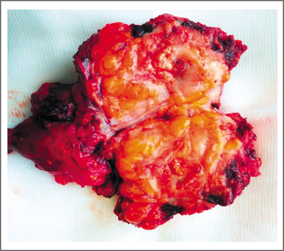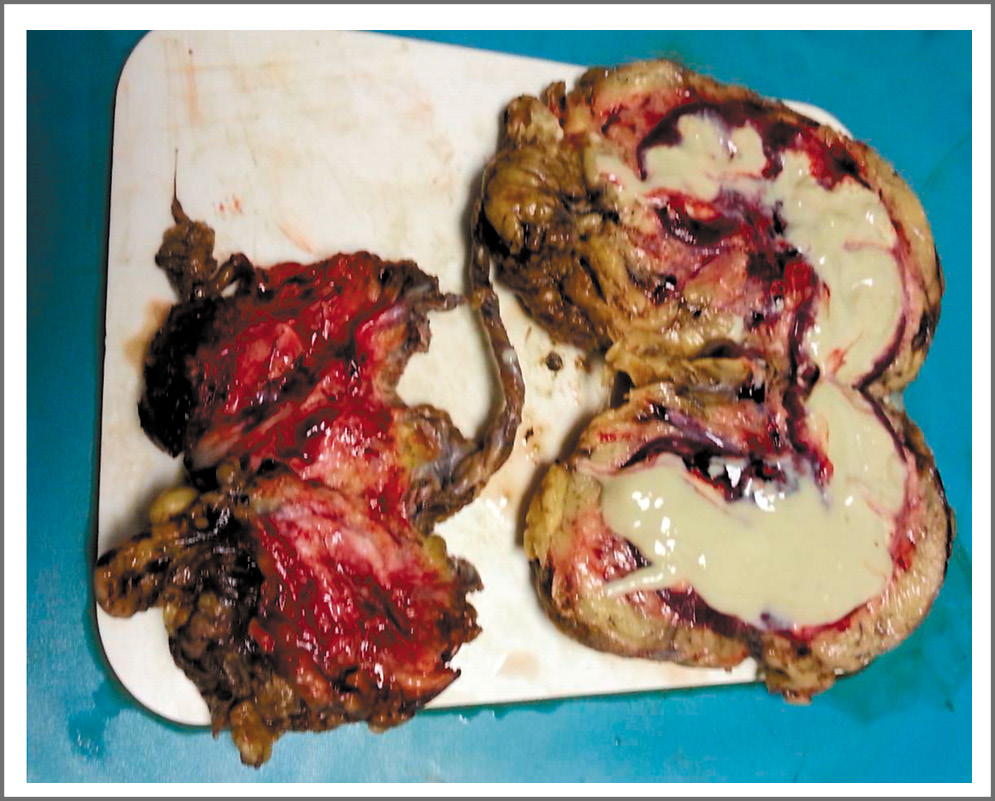 По завершении интенсивной фазы терапии вернулись к вопросу о выполнении хирургического пособия. В ноябре 2019 г. выполнена нефрэктомия справа лапароскопически. В ходе операции в брюшной полости обнаружен умеренный спаечный процесс. Течение послеоперационного периода гладкое. Макропрепарат представлен на рис. 2.