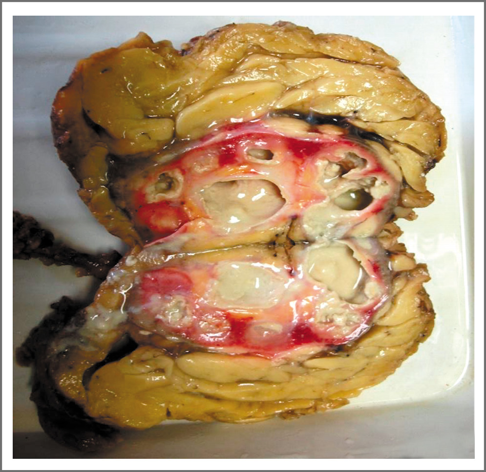 Рис. 3. Поликавернозный нефротуберкулез с обильным казеозным содержимым каверн, туберкулез мочевого пузыря 4-й стадии с формированием микроцистиса. / Fig. 3. Polycavernous nephrotuberculosis with abundant caseous cavernous contents, stage 4 bladder tuberculosis with microcystis formation.