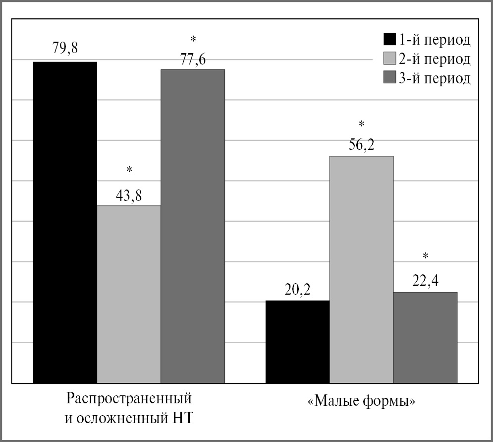 Рис. 5. Динамика структуры туберкулеза почек. Примечание. НТ – нефротуберкулез; *различие статистически значимо между периодами. / Fig. 5. Dynamics of the structure of renal tuberculosis.