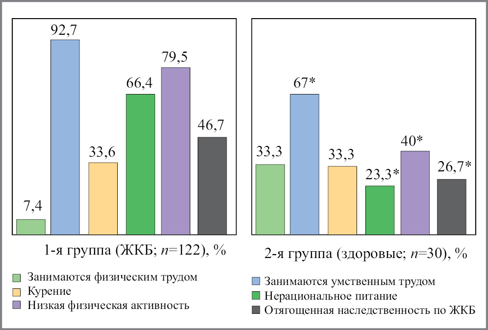 Анализ половой принадлежности показал, что 1 и 2-я группы с ЖКБ представлены преимущественно женским контингентом. Так, в 1-й группе – 77,9% женщин, во 2-й – 80%. При сопоставлении 1 и 2-й групп обнаружено, что пациенты с ЖКБ чаще относились к группе лиц умственного труда, имели низкую физическую активность, оказались привержены нерациональному питанию и чаще указывали на наличие отягощенной наследственности по ЖКБ (рис. 1).