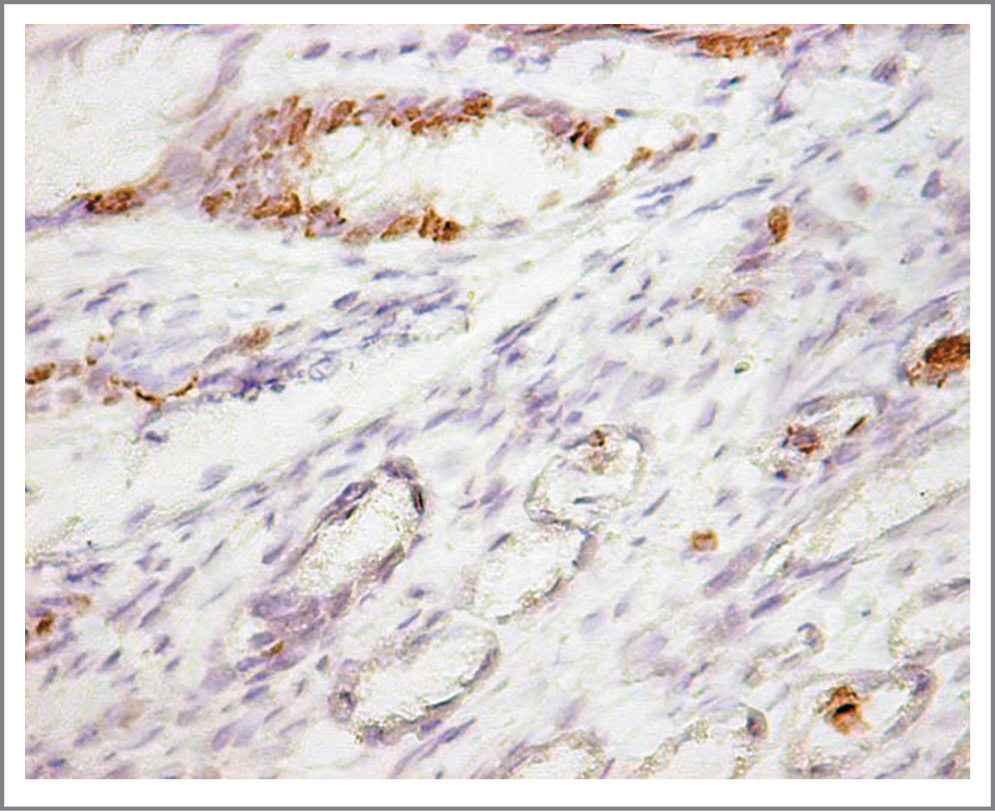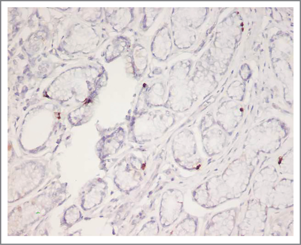 Рис. 3. Здоровый человек. Антральный отдел желудка. Нормальное количество М-клеток. Иммуногистохимический метод (×400).