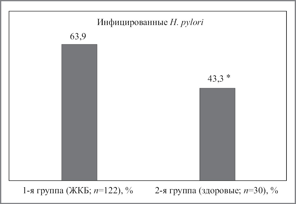 Принимая во внимание существующую взаимосвязь между H. pylori и камнеобразованием в желчном пузыре, мы посчитали целесообразным исследовать распространенность данной инфекции в исследуемых группах (рис. 4). Так, наибольший процент инфицированных зарегистрирован у пациентов с ЖКБ – 63,9%, а наименьший процент инфицированности определялся в группе здоровых респондентов – 43,3% (χ2=4,25, р<0,05).