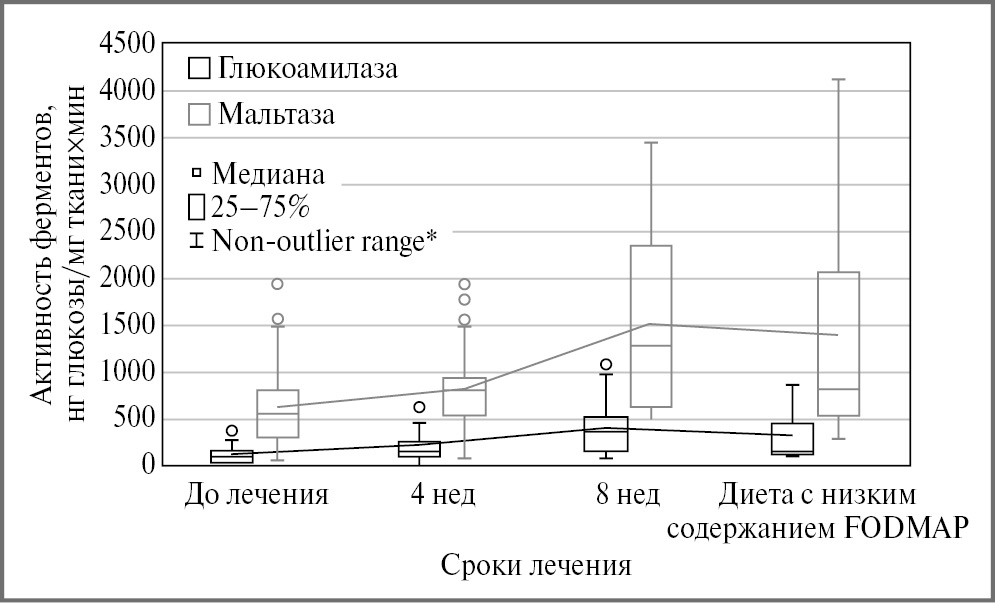 Рис. 1. Динамика активности глюкоамилазы и мальтазы у больных ЭНМП в зависимости от сроков лечения. Примечание. Здесь и далее в табл. 2: Non-outlier range – разница между 99 и 1-м процентилями. / Fig. 1. Dynamics of glucoamylase and maltase activity in patients with ENMP depending on the duration of treatment.