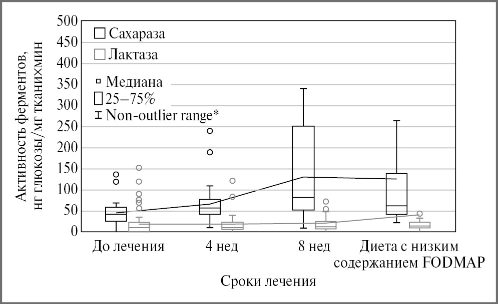 При соблюдении диеты с низким содержанием FODMAP у пациентов с ЭНМП уменьшаются клинические симптомы, свойственные непереносимости ферментируемых углеводов, и повышается активность мембранных ферментов СОТК, но при переходе на обычный рацион клинические симптомы пищевой непереносимости вновь появляются. Под влиянием ребамипида улучшается переносимость ферментируемых углеводов, активность ферментов СОТК увеличивается последовательно через 4 и 8 нед.