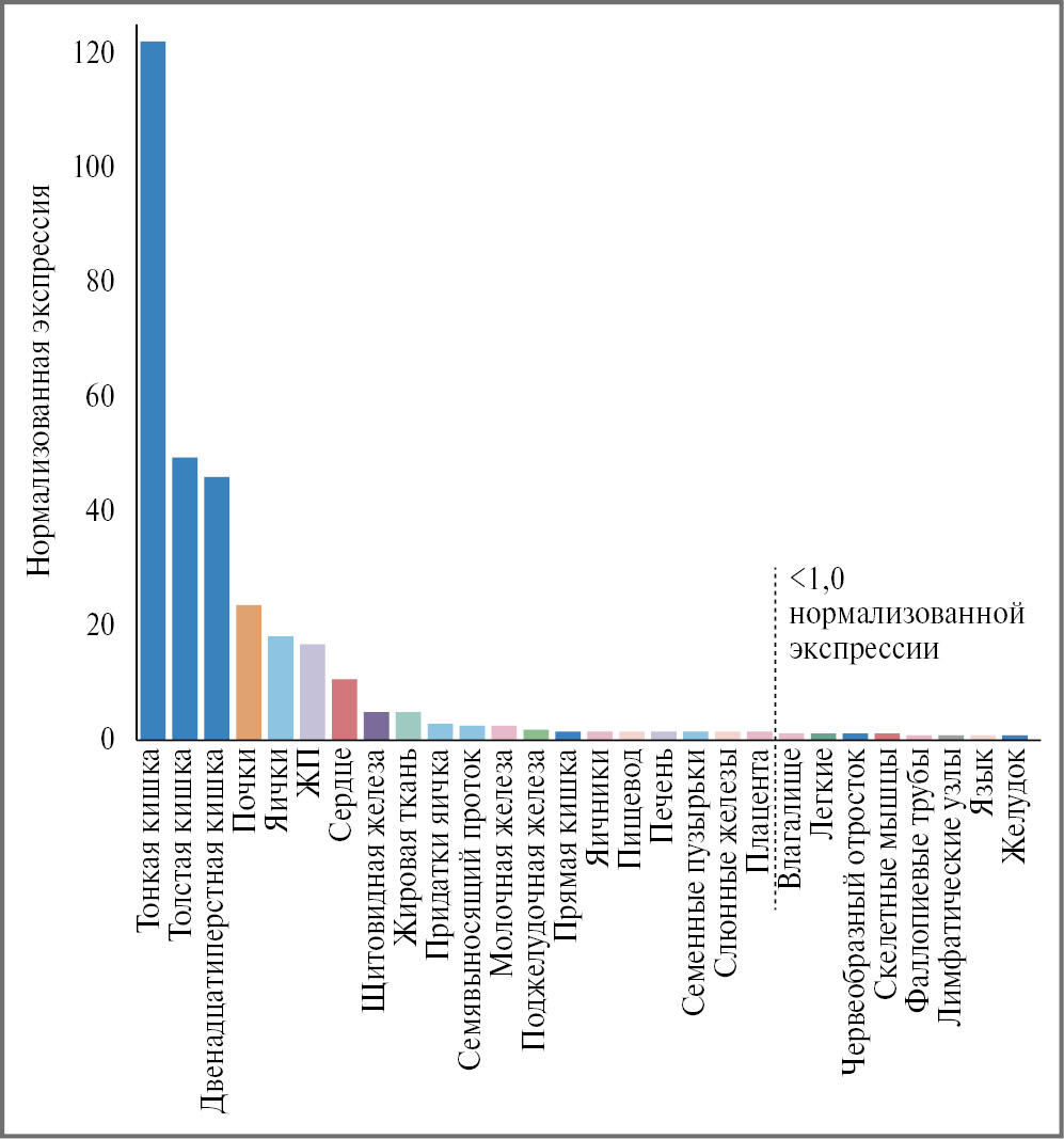 Также известно, что SARS-CoV-2 способен проникать в клетки за счет взаимодействия с рАПФ2 [11]. В свою очередь, экспрессия рАПФ2 в ЖП крайне высока по сравнению с большинством других органов и тканей, особенно это касается железистых клеток (рис. 1) [12].