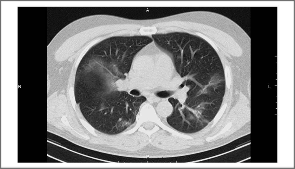Мужчина, 41 год, 06.10.2021 отметил повышение температуры тела до 39,0°С, появление приступообразного сухого кашля, потерю обоняния. На момент госпитализации имел сопутствующее заболевание – сахарный диабет 1-го типа. Ему 06.10.2021 выполнена спиральная компьютерная томография (СКТ) органов грудной полости (ОГП), по данным которой выявлены двусторонние фокусы «матового стекла», признаки вирусной пневмонии, объем поражения ~25% (рис. 2). Получен положительный результат ПЦР-мазка из зева на РНК SARS-CoV-2 от 06.10.2021.