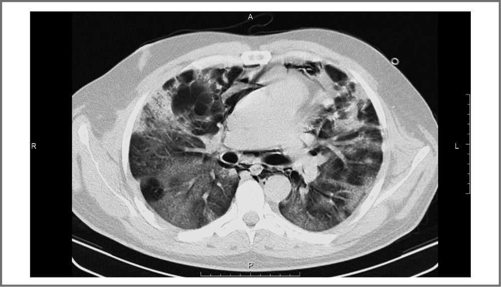 Несмотря на проводимую комбинированную терапию заболевания, синдром инфекционной интоксикации длительно не купировался, сохранялась лихорадка до 39,0°С, на 8-е сутки отмечалось нарастание дыхательной недостаточности (ДН) до 3-й степени. Частота дыхательных движений увеличилась до 35 в минуту, SaO2 снизилась до 73%. В клиническом и биохимическом анализах крови наблюдались нейтрофильный лейкоцитоз до 19,8×109/л без палочкоядерного сдвига, гипопротеинемия до 49,3 г/л, гипергликемия до 18 ммоль/л.
