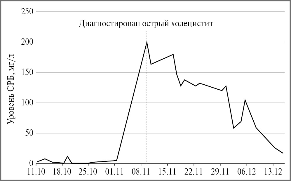 08.11.2021 (32-е сутки болезни) при окончании глюкокортикостероидной терапии к вечеру появилась боль в правом подреберье, рвота, отсутствие аппетита, повышение температура тела до 39,0°С. При пальпации живота отмечалась выраженная болезненность в правом подреберье. В клиническом анализе крови зарегистрирован лейкоцитоз 17,6×109/л, тромбоцитоз 472×109/л, нарастание скорости оседания эритроцитов до 34 мм/ч. В биохимическом анализе крови наблюдались гипергликемия 11,82 ммоль/л, гипопротеинемия 49,9 г/л, гипоальбуминемия 25,7 г/л, повышение аланинаминотрансферазы – 181,7 ЕД/л, аспартатаминотрансферазы – 44,8 ЕД/л, С-реактивного белка (СРБ) – 200,9 мг/л (рис. 4).