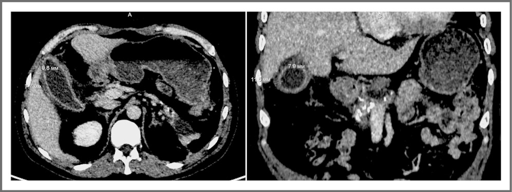Рис. 5. СКТ живота от 09.11.2021. ЖП увеличен до 100×43 мм. Отмечается утолщение стенки ЖП до 11,5 мм и ее локальное расслоение на уровне дна. В просвете прослеживается жидкостное содержимое. Окружающая клетчатка реактивно уплотнена.