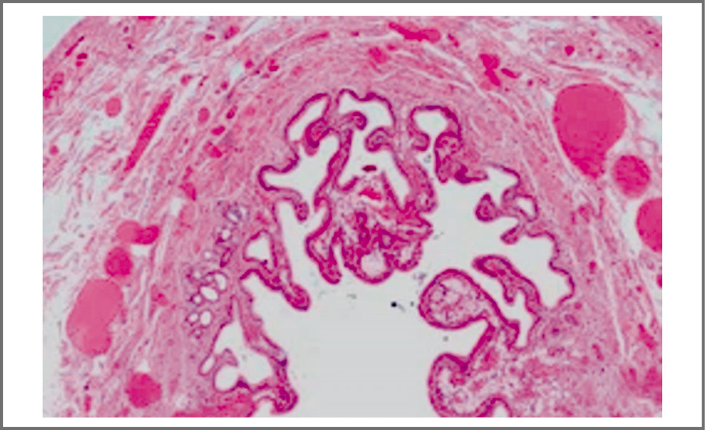 Рис. 6. Микропрепарат стенки удаленного ЖП. Отмечается диффузное утолщение стенки ЖП с частичным расслоением, деформированные ворсинки слизистой оболочки, синусы Рокитанского–Ашоффа.