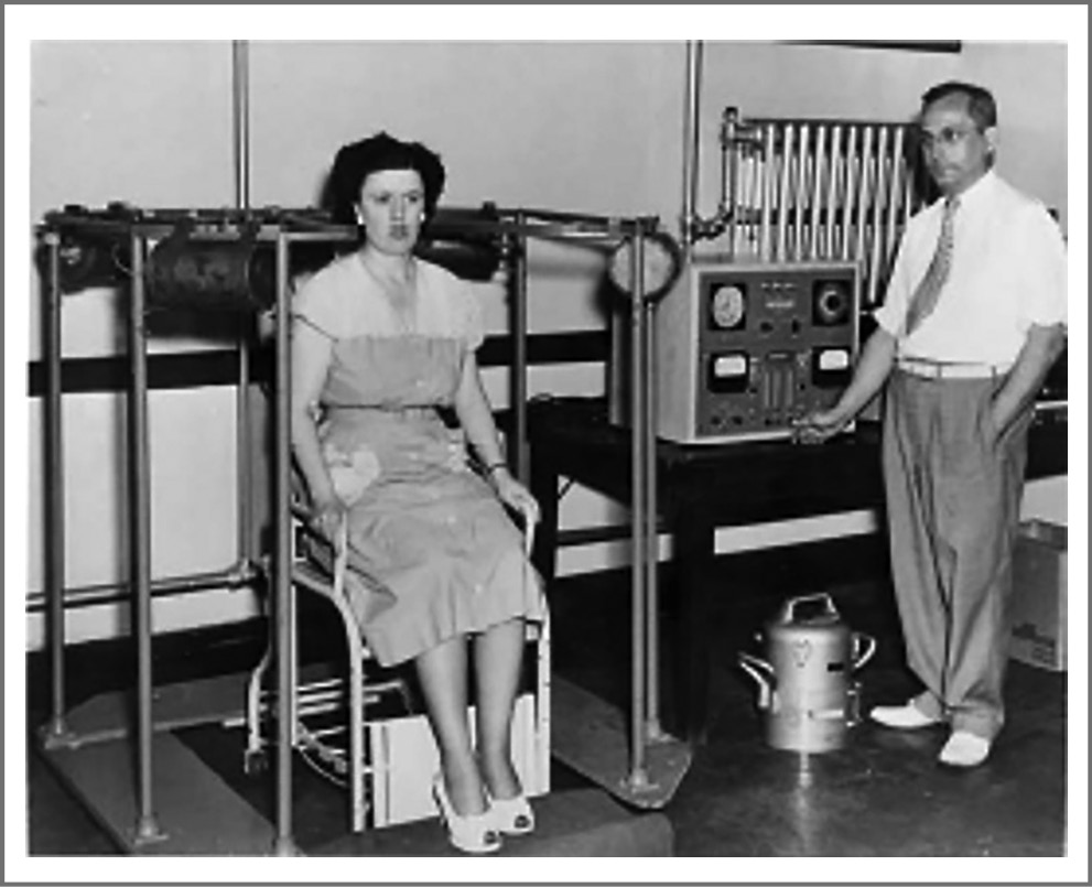 3. Рис. 2. Демонстрация работы мультискалера (слева – доброволец, справа – Saul Hertz). Мультискалер измерял поглощение радиоактивного йода. Полученные данные использовались в дозиметрии для расчета необходимой терапевтической дозы радиоактивного йода для каждого конкретного пациента.