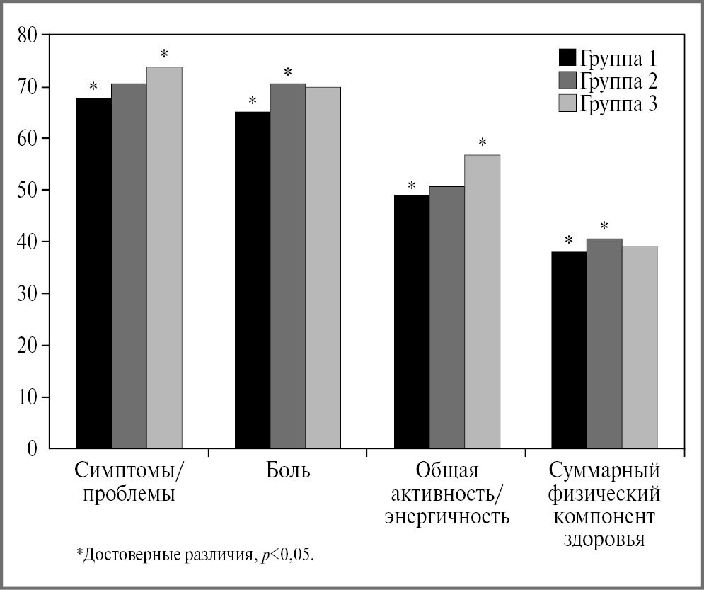 Кроме того, при сравнительном анализе КЖ в трех группах пациентов выявлены более высокие показатели КЖ среди пациентов c более высоким уровнем Hb по шкалам «симптомы/проблемы», «боль», «общая активность/энергичность» и «суммарный физический компонент здоровья» (рис. 1). При этом повышение уровня Hb до целевых значений (группа 2) приводило к улучшению КЖ по шкалам «боль» (65,0±24,0 и 70,4±21,7; p1,2<0,04) и «суммарный физический компонент здоровья» (38,1±9,2 и 40,6±9,0; p1,2=0,046), а повышение уровня Hb до значений выше целевого уровня (группа 3) – к улучшению КЖ по шкалам «симптомы/проблемы» (67,9±19,2 и 73,8±20,5; p1,3=0,025) и «общая активность/энергичность» (49,1±20,0 и 56,9±22,0; p1,3=0,028).
