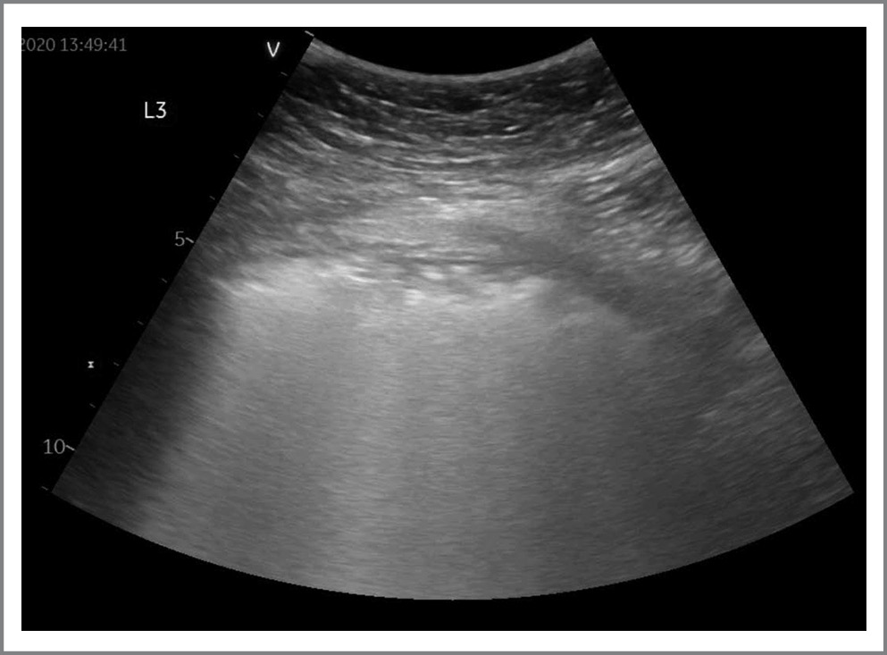 Рис. 3. УЗИ легких у пациента с COVID-19. На рис. представлены изменения по типу «белое легкое». / Fig. 3. Lung ultrasound in a patient with COVID-19. The figure shows changes of the "white lung" type.