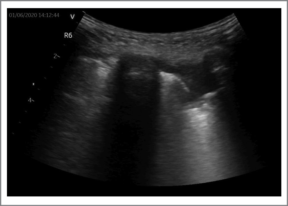 Рис. 2. УЗИ легких у пациента с COVID-19. На рис. представлены субплевральные консолидации. / Fig. 2. Lung ultrasound in a patient with COVID-19. The figure shows subpleural consolidations.