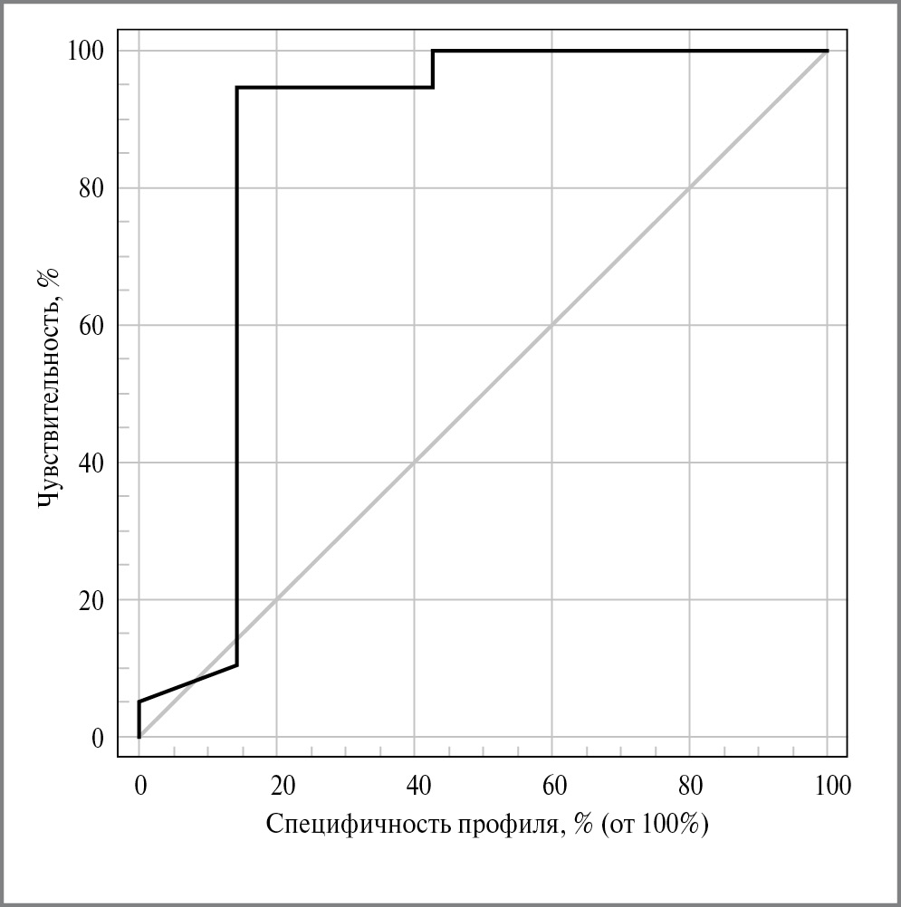 С целью оценки диагностической значимости УЗИ легких в выявлении тяжелого поражения легочной ткани, соответствующей картине КТ-3–4, у обследованных больных проведен ROC-анализ. При отрезном значении ≥58,0% продемонстрирована высокая диагностическая ценность УЗИ легких в выявлении тяжелого поражения легочной ткани (рис. 4).