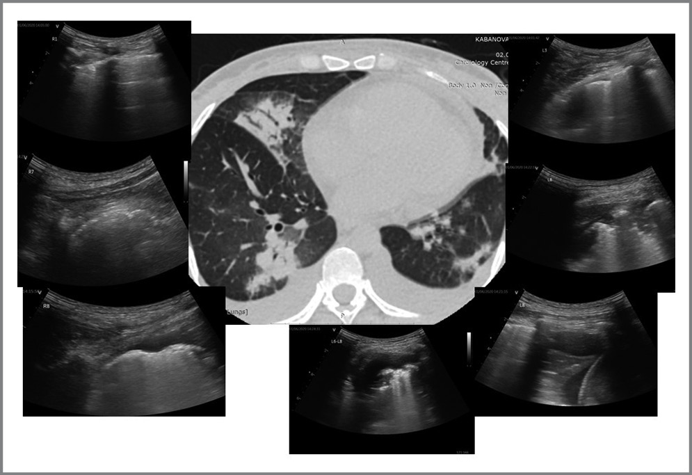 Рис. 5. Сопоставление УЗИ легких с данными КТ согласно разработанному протоколу у пациента с COVID-19 при поступлении в стационар. / Fig. 5. Comparison of lung ultrasound with CT data according to the developed protocol in a patient with COVID-19 upon admission to the hospital.