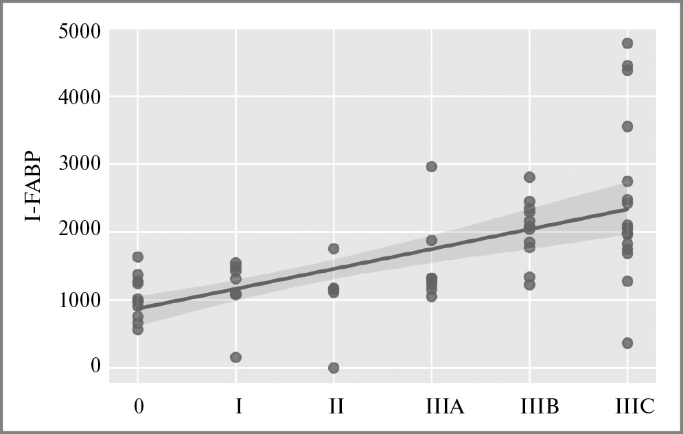 2. Fig. 1. Graph of visualization of distributions of I-FABP values depending on the degree of mucous membrane of the small intestine atrophy according to Marsh (r=0.540, p-value=0.01).