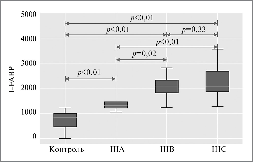 При этом у больных с наиболее выраженной степенью атрофии (Марш IIIА–С) уровень I-FABP достоверно отличался от контроля в зависимости от степени повреждения СОТК: Марш IIIA (медиана 1310 пг/мл, межквартильный диапазон 1212–1461 пг/мл), Марш IIIB (медиана 2090 пг/мл, межквартильный диапазон 1812–2322 пг/мл), а также Марш IIIC (медиана 2058 пг/мл, межквартильный диапазон 1858–2678 пг/мл); рис. 3.