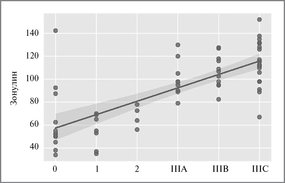 Рис. 4. График визуализации распределений значений зонулина в зависимости от степени атрофии СОТК по Маршу (r=0,585, p-value<0,01). / Fig. 4. Graph of visualization of the distributions of zonulin values depending on the degree of mucosa atrophy according to Marsh (r=0.585, p-value<0.01).
