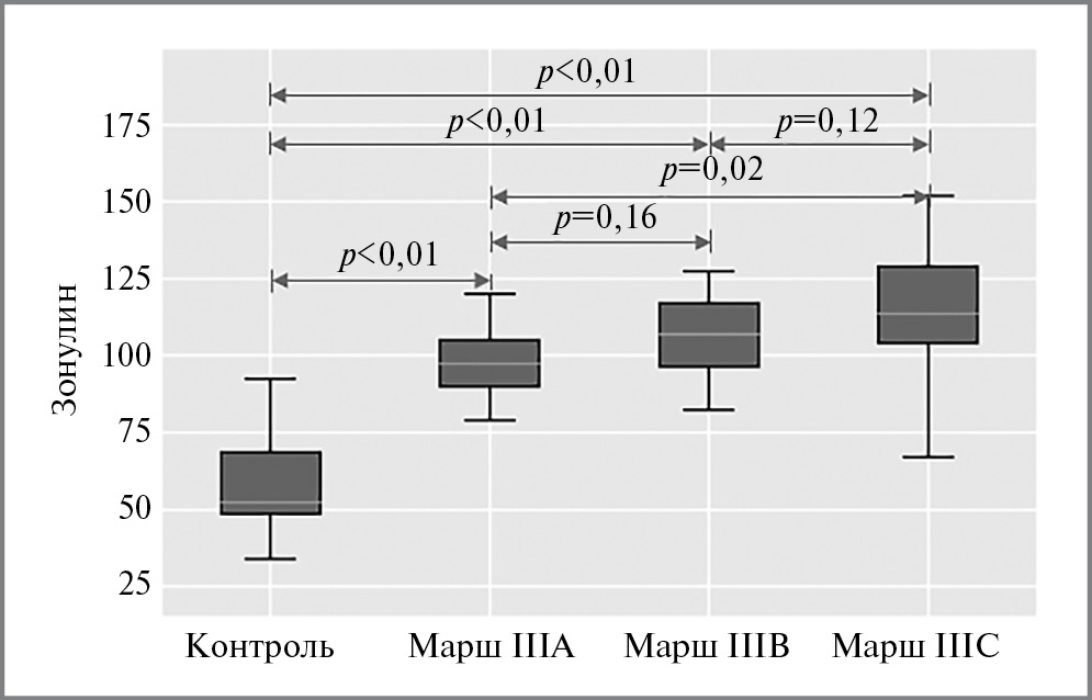 Рис. 5. Концентрация зонулина в кале в зависимости от степени атрофии СОТК по Маршу. / Fig. 5. Concentration of zonulin in feces, depending on the degree of atrophy of the mucous small intestine according to Marsh.
