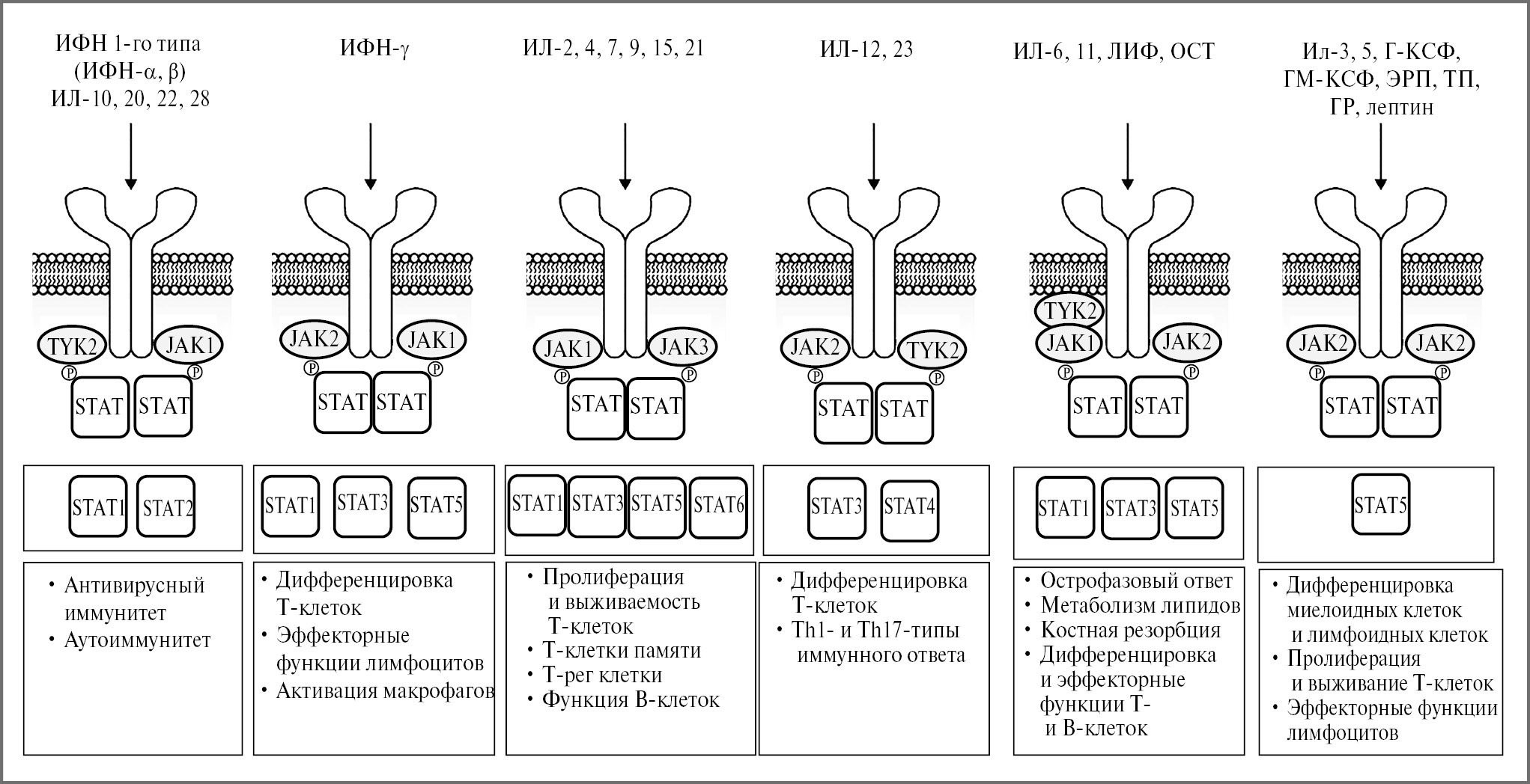 Рис. 1. Сигнальный путь JAK-STAT и селективность ингибиторов JAK.