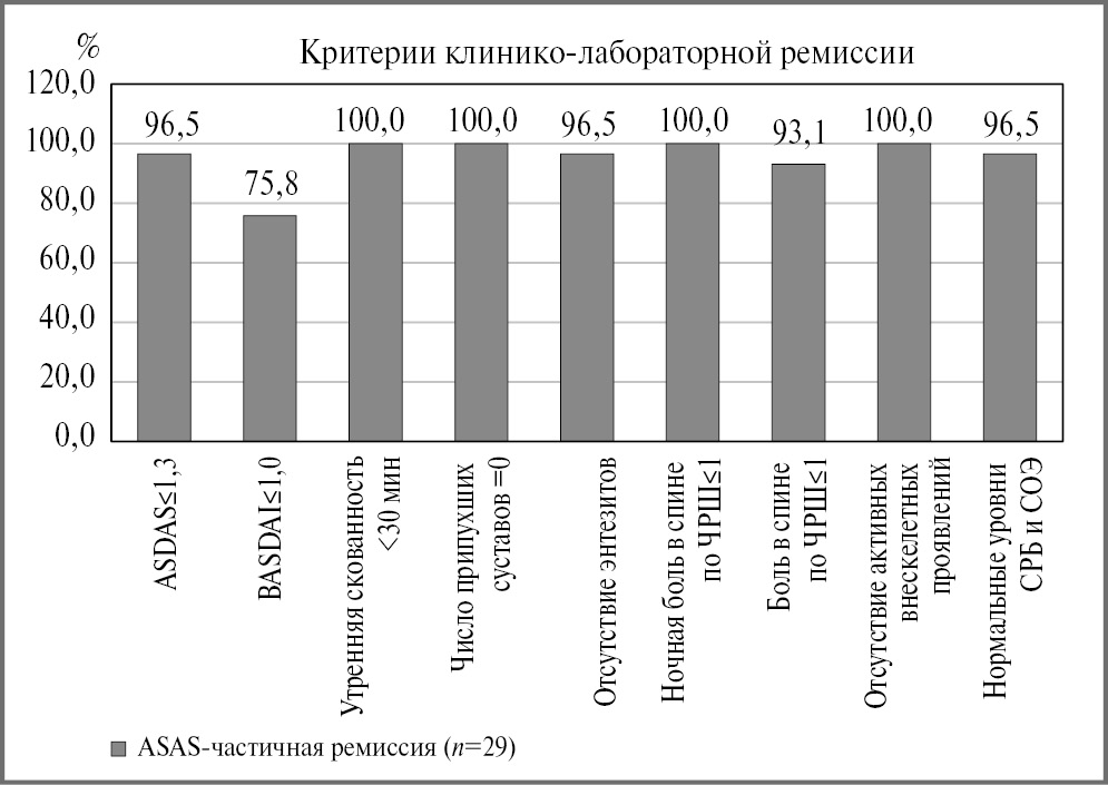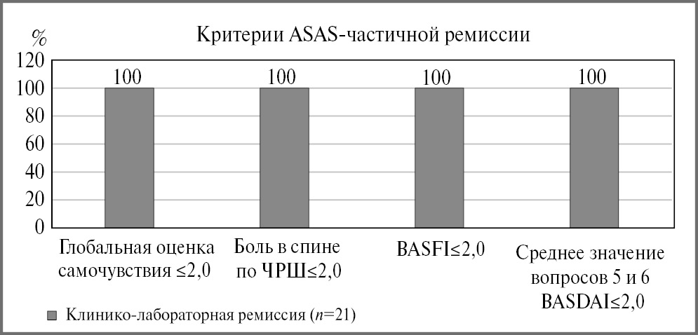 При сопоставлении данных пациентов, достигших клинико-лабораторной ремиссии, с критериями ASAS-частичной ремиссии установлено, что все 100% больных с ранним аксСпА соответствовали критериям ASAS-частичной ремиссии (рис. 2).