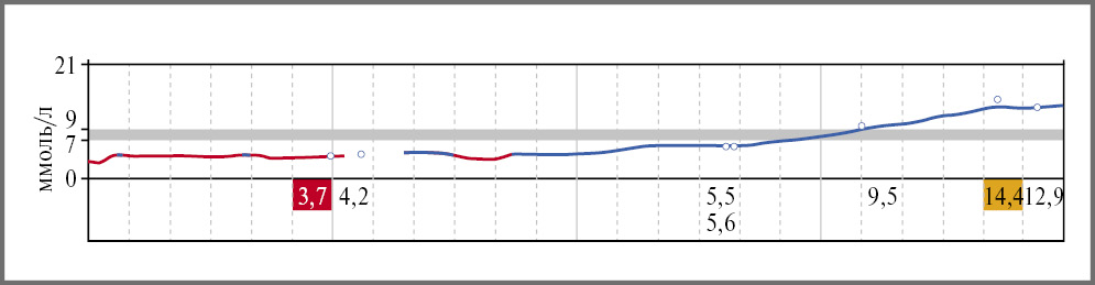 Для оценки гликемического контроля пациенту в ранний послеоперационный период проведен непрерывный мониторинг гликемии (НМГ) при помощи прибора FreeStyle Libre.