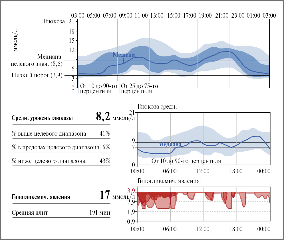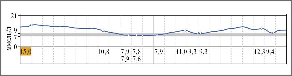 За время госпитализации удалось достичь целевых показателей гликемии натощак и перед основными приемами пищи – 8–11 ммоль/л, а главное – ликвидировать гипогликемии.