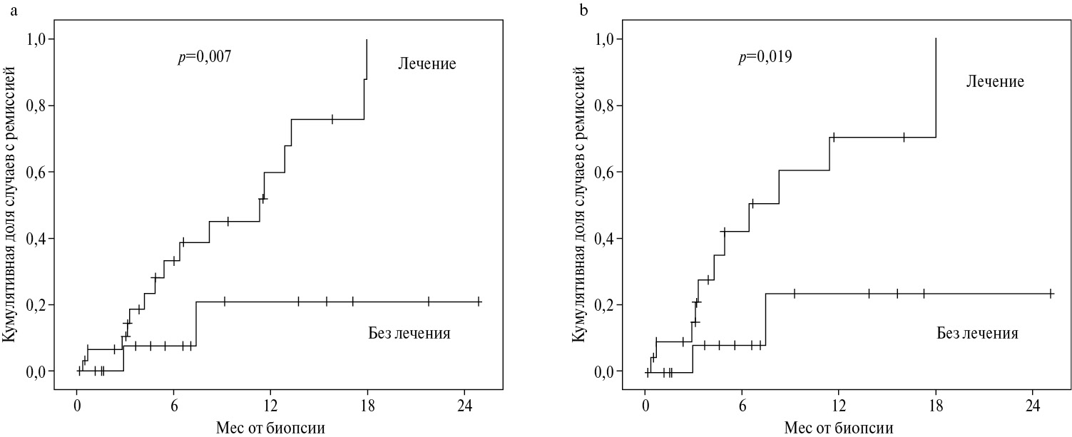 Рис. 1. Кумулятивная частота ремиссий С3-ГП в ранние сроки наблюдения при проведении лечения и в случае его отсутствия: а – общая группа; b – при первичной С3-ГП. / Fig. 1. Cumulative rates of C3-GP remissions in the early follow-up period with and without treatment: a – all patients; b – with (upper line) and without treatment (lower line), in primary C3-GP.