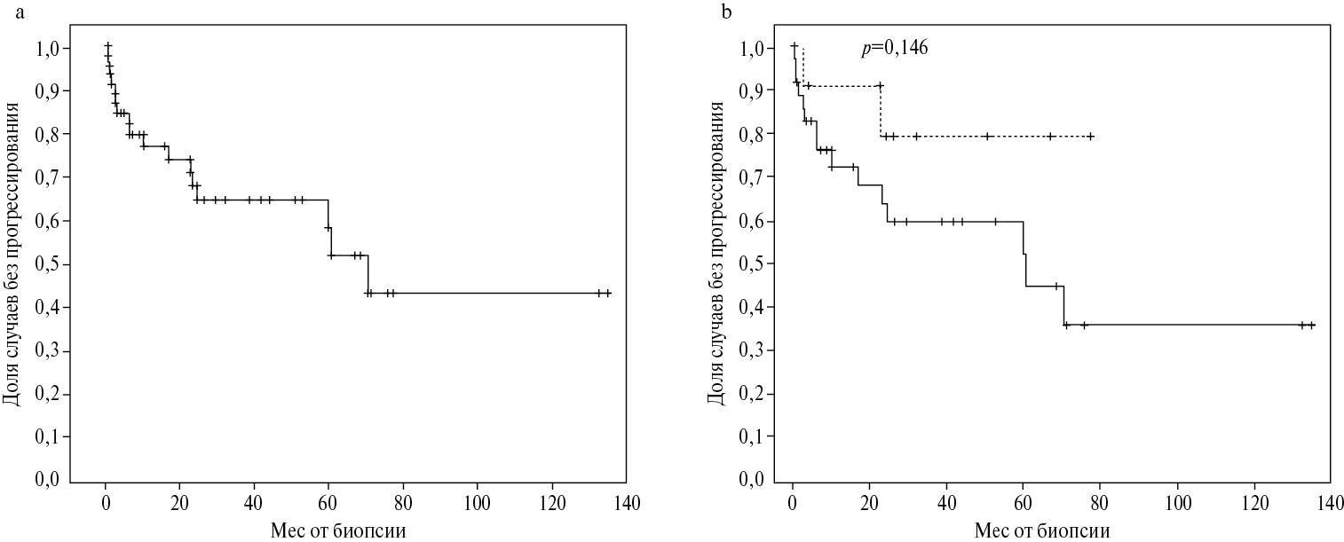 Заболевание прогрессировало у 17 пациентов (15 случаев – при пС3-ГП, 2 – при С3-ГП на фоне плазмоклеточной дискразии); рис. 2, а. Из них заместительная почечная терапия начата в 7 случаях (6 – при пС3-ГП). Кумулятивная доля случаев без прогрессирования недостоверно выше при вС3-ГП (рис. 2, b).