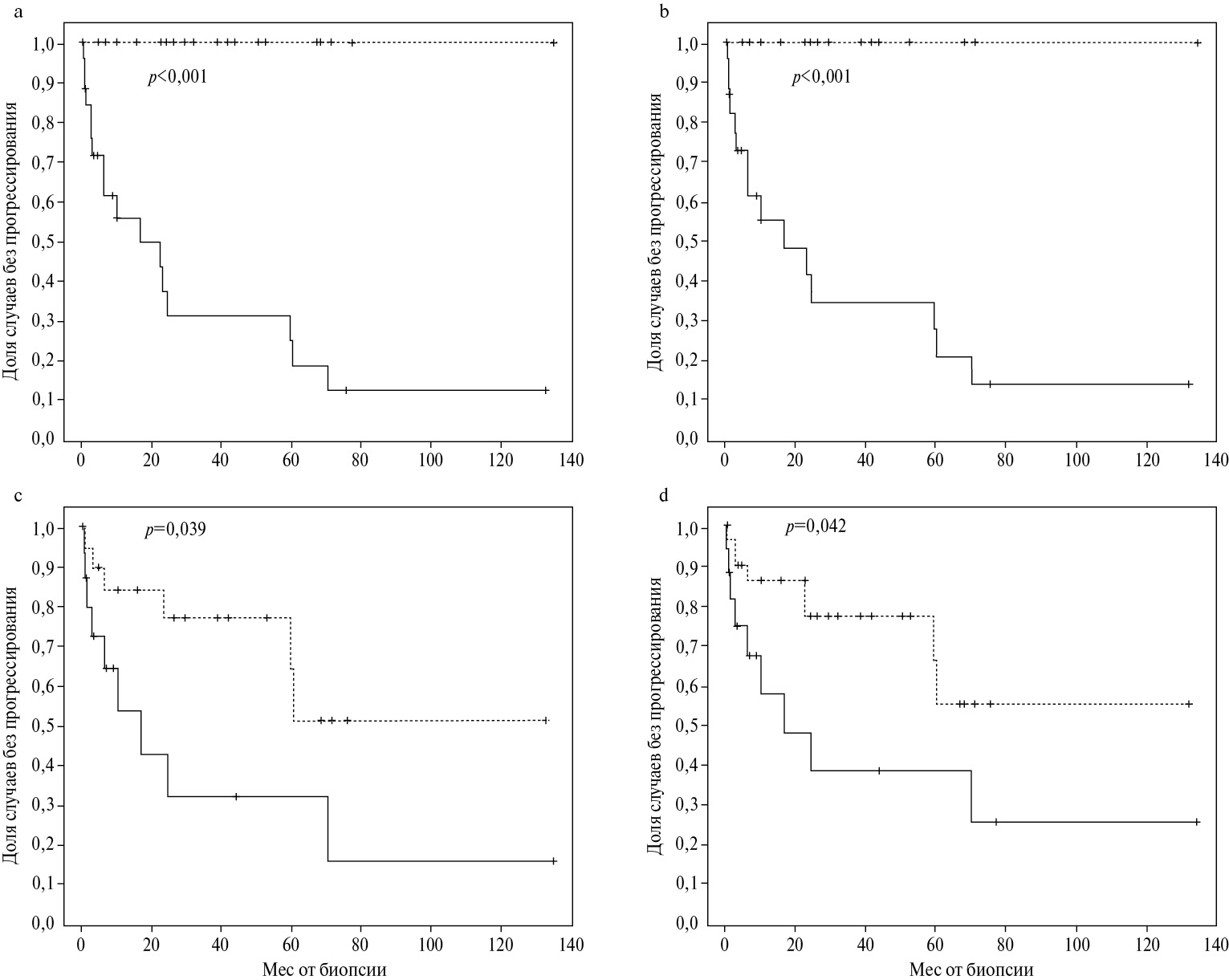 Ремиссии в ходе наблюдения мы зарегистрировали при пС3-ГП в 41% случаев, что соответствует данным других исследований, от 34 до 48% [6, 11]. Следует отметить, что отличия в выбранных критериях ремиссии и прогрессирования, а также возрастная гетерогенность когорт ограничивают прямые сопоставления [5, 6, 11].