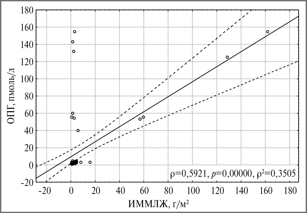 Рис. 1. Корреляции между уровнем ОПГ сыворотки крови и ИММЛЖ в группе пациентов в целом (n=110). Определена сильная прямая связь, нарастающая по мере роста концентрации ОПГ и величины ИММЛЖ (анализ по Спирмену). / Fig. 1. Correlation between serum osteoprotegerin (OPG) and LVMI in the patient group as a whole (n=110). A strong direct relationship was revealed that grows with an increase in the concentration of OPG and the value of LVMI (Spearman analysis).
