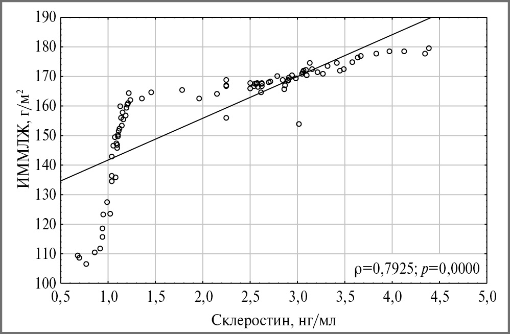 Рис. 2. Корреляции между уровнем склеростина и ИММЛЖ в группе пациентов в целом (n=110). Установленная прямая связь высокодостоверна, но менее выражена, чем зависимость между ОПГ и ИММЛЖ (анализ по Спирмену). / Fig. 2. Correlations between sclerostin level and LVMI in the patient group as a whole (n=110). The revealed direct relationship is highly reliable, but less pronounced than the dependence of OPG and LVMI (Spearman analysis).