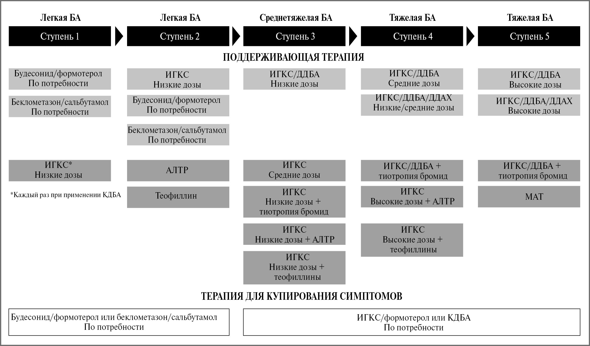 Для 1-й ступени в качестве поддерживающей терапии предпочтительно применять будесонид + формотерол в фиксированной комбинации с дозировкой 160/4,5 мкг/доза или беклометазон + сальбутамол по потребности; в качестве альтернативной терапии используют низкие дозы ИГКС каждый раз при приеме КДБА. На 2-й ступени терапии БА необходимо ежедневно применять ИГКС в низких дозах или использовать только по потребности будесонид + формотерол в дозировке 160/4,5 мкг/доза или беклометазон + сальбутамол. В качестве альтернативной поддерживающей терапии могут быть использованы АЛТР и теофиллин в низких дозах [1, 6]. На 3, 4 и 5-й ступенях в качестве предпочтительной поддерживающей терапии применяют ИГКС/ДДБА в низкой, средней или высокой дозе соответственно [1, 6]. На 5-й ступени возможно присоединять к терапии ДДАХ или МАТ [1, 6].