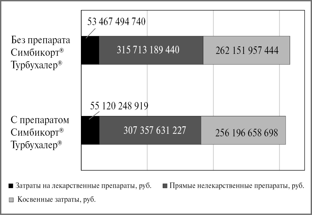 Прямые медицинские затраты на фоне применения препарата будесонид + формотерол (Симбикорт® Турбухалер®160/4,5 мкг/доза) ниже, чем в группе сравнения, в которой данное лекарственное средство не применяли. Снижение частоты обострений сопряжено с уменьшением косвенных затрат, что обусловливает дополнительную выгоду от применения фиксированной комбинации будесонид + формотерол (Симбикорт® Турбухалер® 160/4,5 мкг/доза). Таким образом, увеличение доли пациентов с БА различной степени тяжести, получающих терапию препаратом будесонид + формотерол (Симбикорт® Турбухалер® 160/4,5 мкг/доза), фармакоэкономически обосновано и целесообразно.