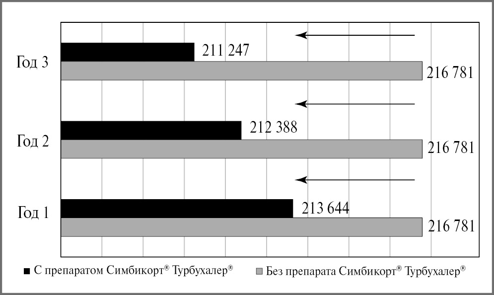 Как видно из рис. 2, применение препарата Симбикорт® Турбухалер® 160/4,5 мкг/доза сопровождается более низкими затратами по сравнению с отсутствием препарата в клинической практике.
