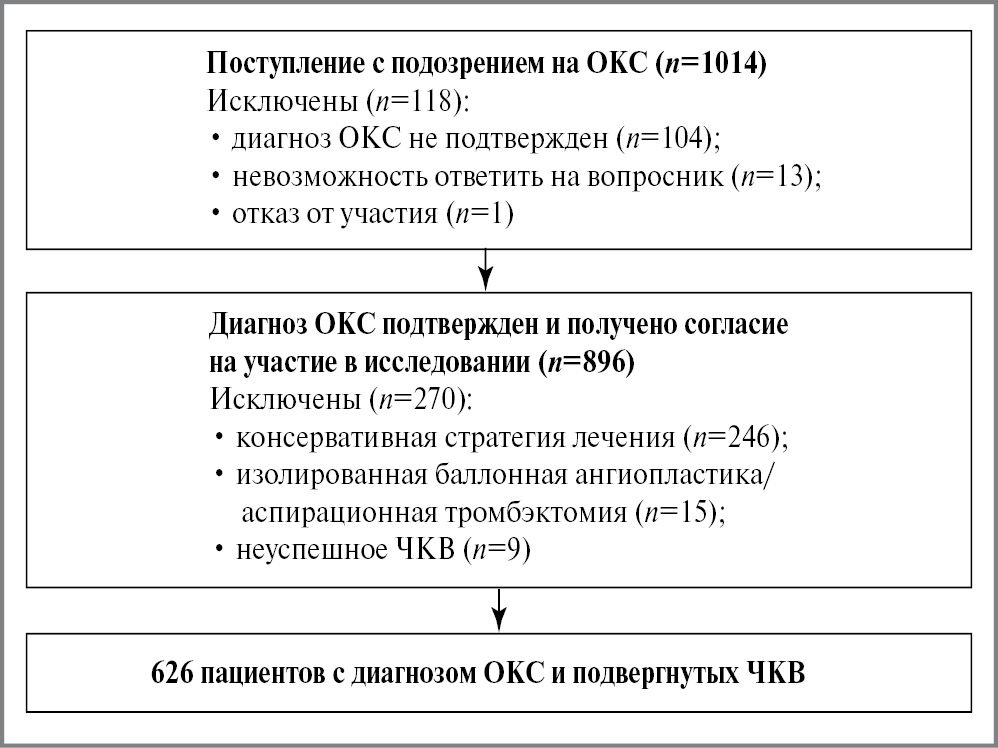 На результаты исследования могло повлиять искажение данных, допущенное на различных этапах сбора и оценки информации. Итог устного опроса мог зависеть от тяжести состояния пациента. Исключение пациентов в силу тяжести состояния, неэффективности ЧКВ или отказа могло исказить репрезентативность выборки, однако подобных больных было немного (см. рис. 1). Некоторые потенциальные конфаундеры (например, предшествующая медикаментозная терапия) могли быть не учтены. В исследование включали только пациентов после успешного ЧКВ, следовательно, необходимо осторожно экстраполировать полученные результаты на всех больных, поступающих с диагнозом ОКС.