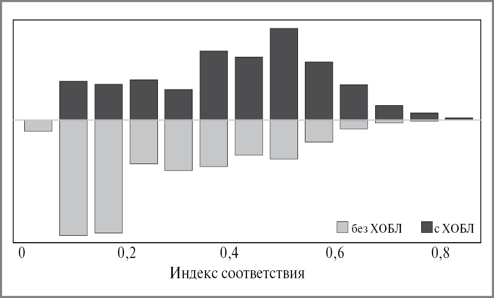 Скорректированные результаты, полученные в ходе двухфакторного логистического регрессионного анализа с учетом факта наличия ХОБЛ и рассчитанного ранее индекса соответствия, подтвердили указанные данные: