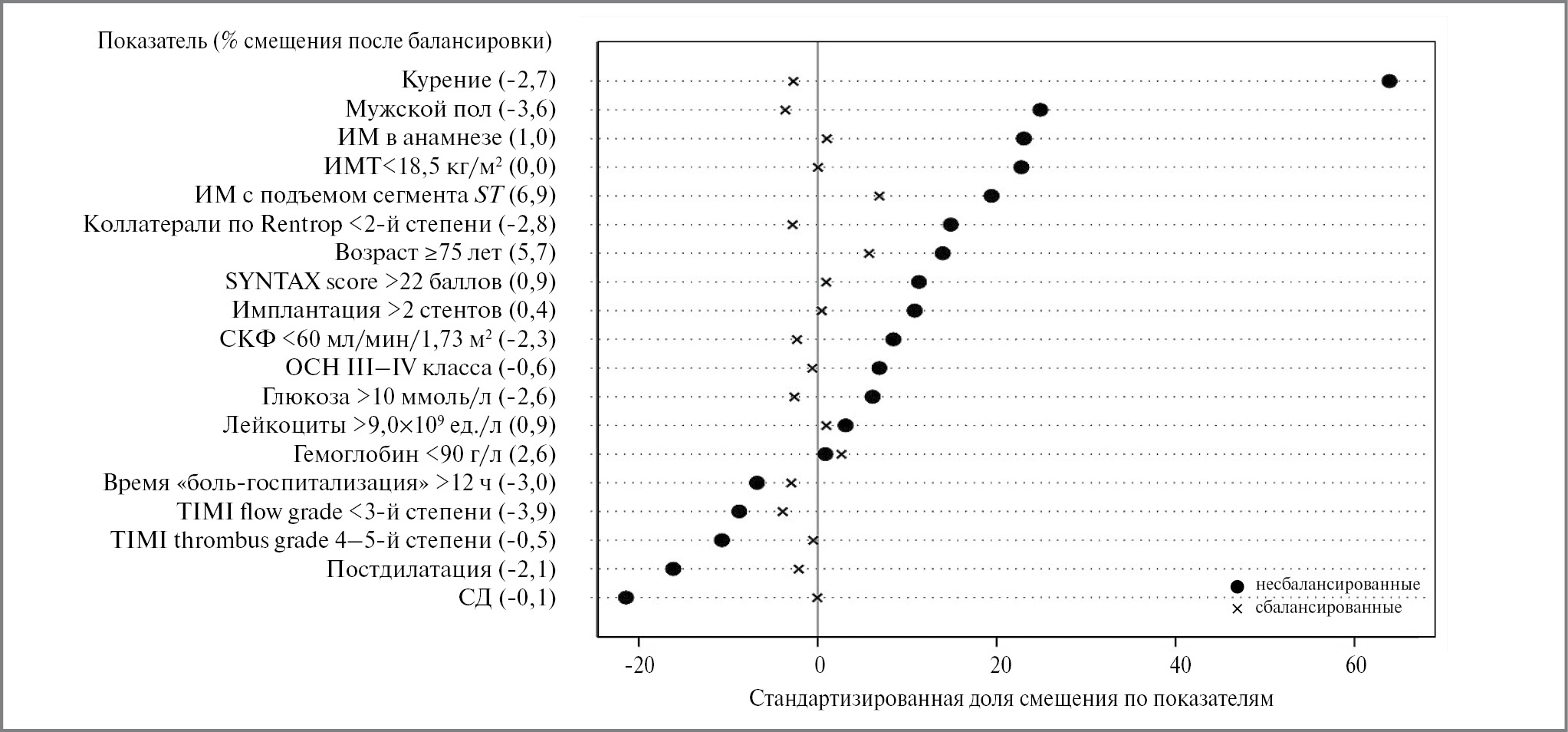 С целью коррекции искажения результатов вследствие влияния конфаундеров применяли метод псевдорандомизации (англ. propensity score matching) [14]. На основании расчета индекса соответствия (англ. propensity score) группы сбалансировали по основным показателям методом взвешивания Кернела [14]. Критерием эффективной балансировки являлось значение стандартизированной доли смещения <10%. Для изучения влияния качественных факторов на бинарный исход применяли логистический регрессионный анализ с использованием «весовых» коэффициентов, полученных в результате взвешивания методом Кернела.