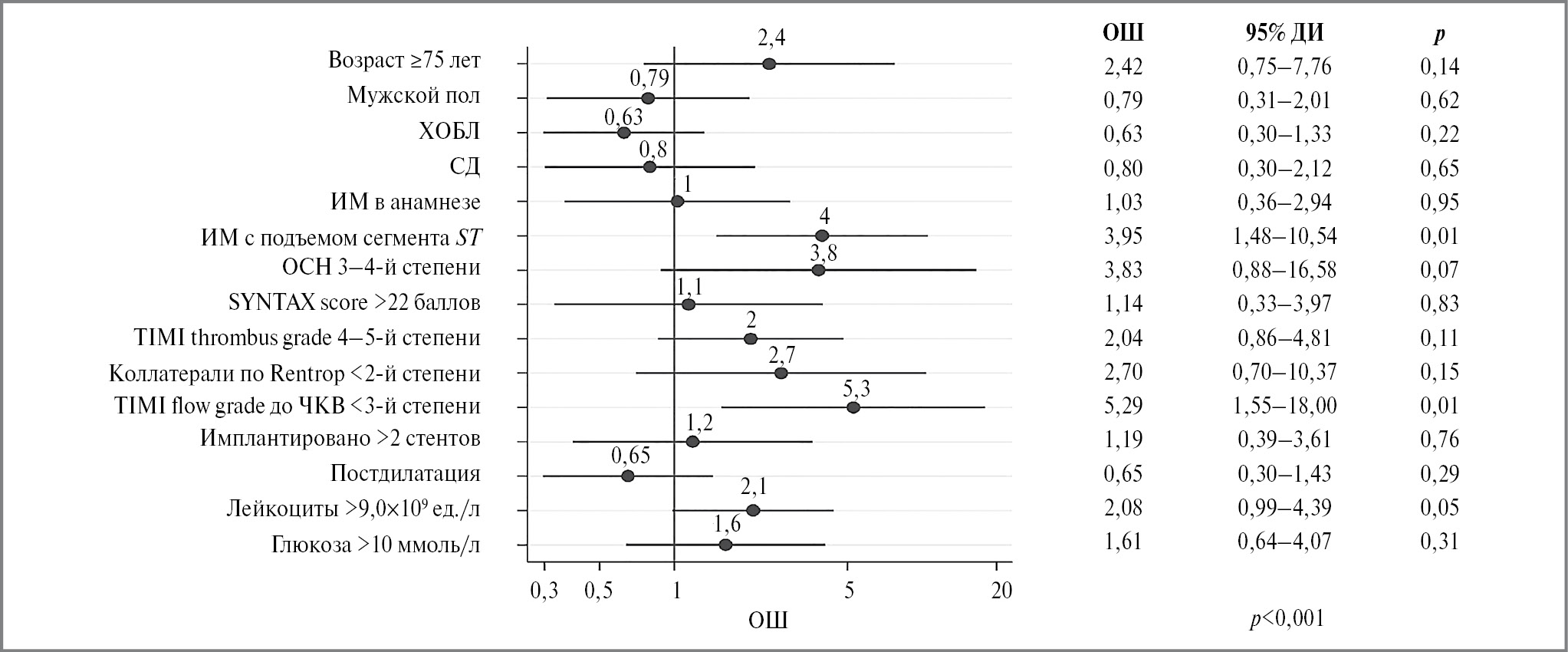 Несколько неожиданным выглядит отсутствие описанной некоторыми авторами связи ХОБЛ с КМСО [7]. На первый взгляд, подобная ассоциация имеет патогенетическое обоснование, т.к. общими компонентами данных состояний являются эндотелиальная дисфункция, воспаление и тромбоз [3, 11, 13]. По всей видимости, отсутствие влияния на риск развития КМСО можно объяснить крайней гетерогенностью патогенеза данного осложнения. К развитию феномена no-reflow могут приводить различные механизмы, комбинация которых у каждого пациента отличается [8]. Отметим, что в рамках данной работы также не прослежено четкой связи с основными предикторами КМСО (время поступления, уровень глюкозы, тромбоз ИОА, выраженность коллатералей, тяжесть острой сердечной недостаточности – ОСН).