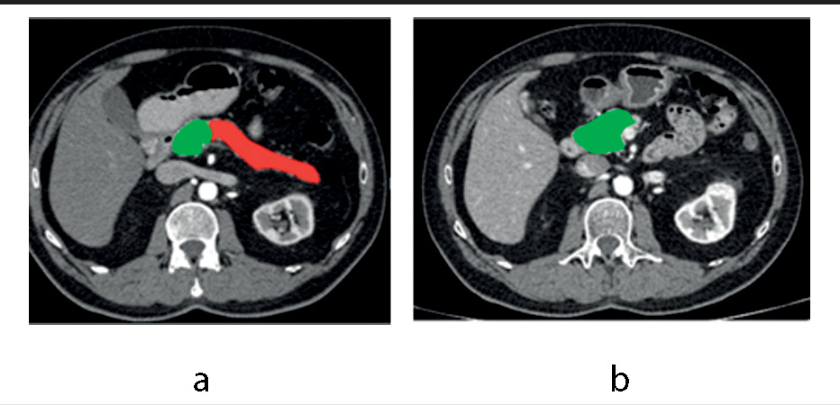 Рис. 1. Пример результатов МСКТ: а – предоперационное исследование, аксиальный срез на уровне L1 (КТ-срез с неполной визуализацией головки железы для демонстрации дистальных ее отделов), поздняя артериальная (панкреатическая) фаза, волюметрия – зеленым выделена сохраняемая часть ПЖ, красным – удаляемая; b – через 6 мес после операции, аксиальный срез на уровне L2 (головка железы визуализирована в наибольшей ее площади), поздняя артериальная (панкреатическая) фаза, волюметрия – зеленым выделена культя ПЖ. / Fig. 1. CT processing: a – preoperative analysis. Axial CT scan, late arterial (pancreatic) phase: green – pancreatic remnant, red – resected part; b – CT scan at 6 months after the operation. Axial CT scan, late arterial (pancreatic) phase: green – pancreatic remnant.