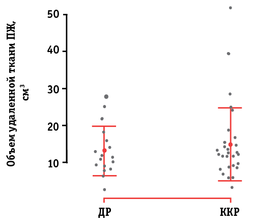 При анализе данных МСКТ получены статистически значимые различия в объеме ПЖ до и после операции: средний объем ПЖ до операции 57,1±28,5 см3, после операции – 42,6±23,9 см3 (p<0,001). Удаленная ткань ПЖ составляла в среднем 25,9±11,2% от общего объема железы до операции. При этом значимой разницы в объеме удаленной (p=0,79) и остаточной (p=0,65) ткани ПЖ при ККР и ДР не получено (рис. 2).