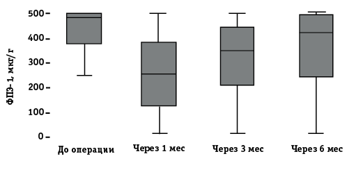 В послеоперационном периоде наблюдается сходная с описанной выше тенденцией картина – после снижения концентрации в 1-м месяце после операции она постепенно возрастает (табл. 2). Средние значения концентрации ФПЭ статистически значимо отличались в зависимости от срока после операции (см. рис. 2).