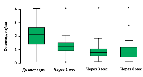 После операции наблюдается падение уровня С-пептида в сыворотке крови в течение первых 3 мес после операции, с последующим его постепенным ростом. При сравнении уровней концентрации С-пептида выявлены статистически значимые отличия между исследованными группами в зависимости от срока после операции (p<0,01). В дооперационном периоде снижение уровня С-пептида ниже 1,1 нг/мл определялось у 8 (17%) пациентов. Через 1 мес после операции снижение концентрации С-пептида ниже 1,1 нг/мл зафиксировано у 30 (63,8%) пациентов. Через 3 мес после операции оставалось 12 (25,5%) пациентов с понижением уровня С-пептида, а через 6 мес число пациентов со снижением концентрации С-пептида уменьшилось до 7 (14,9%). Диаграммы размаха с распределением значений концентрации С-пептида в сыворотке крови в до- и послеоперационном периоде представлены на рис. 4.