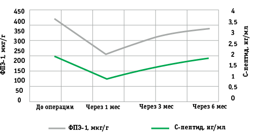 Для количественной оценки ЭкзФ ПЖ определяли уровень ФПЭ-1 методом иммуноферментного анализа по стандартной методике производителя (ScheBo, Германия). Оценку уровня глюкозы плазмы крови проводили ферментативным гексокиназным методом. В качестве показателя ЭндоФ ПЖ проводили определение уровня С-пептида иммунохроматографическим методом по стандартной методике производителя (Siemens, Германия). Материал для исследования – сыворотку крови – собирали до и после операции; послеоперационный забор крови проводили через 1, 3 и через 6 мес после оперативного вмешательства.