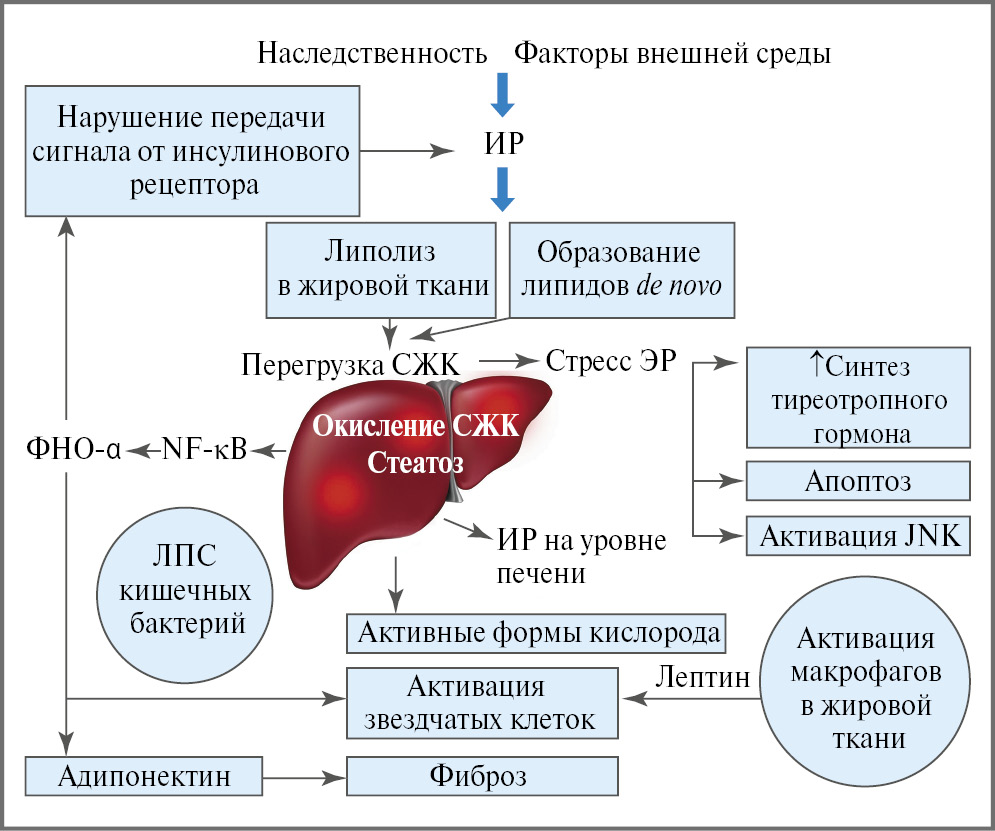 В настоящее время не вызывает сомнений, что дисфункция и воспаление жировой ткани играют немаловажную роль в патогенезе НАЖБП, а новые данные свидетельствуют о том, что процессы, происходящие в тонкой кишке, также вовлечены в развитие патологического процесса [4].